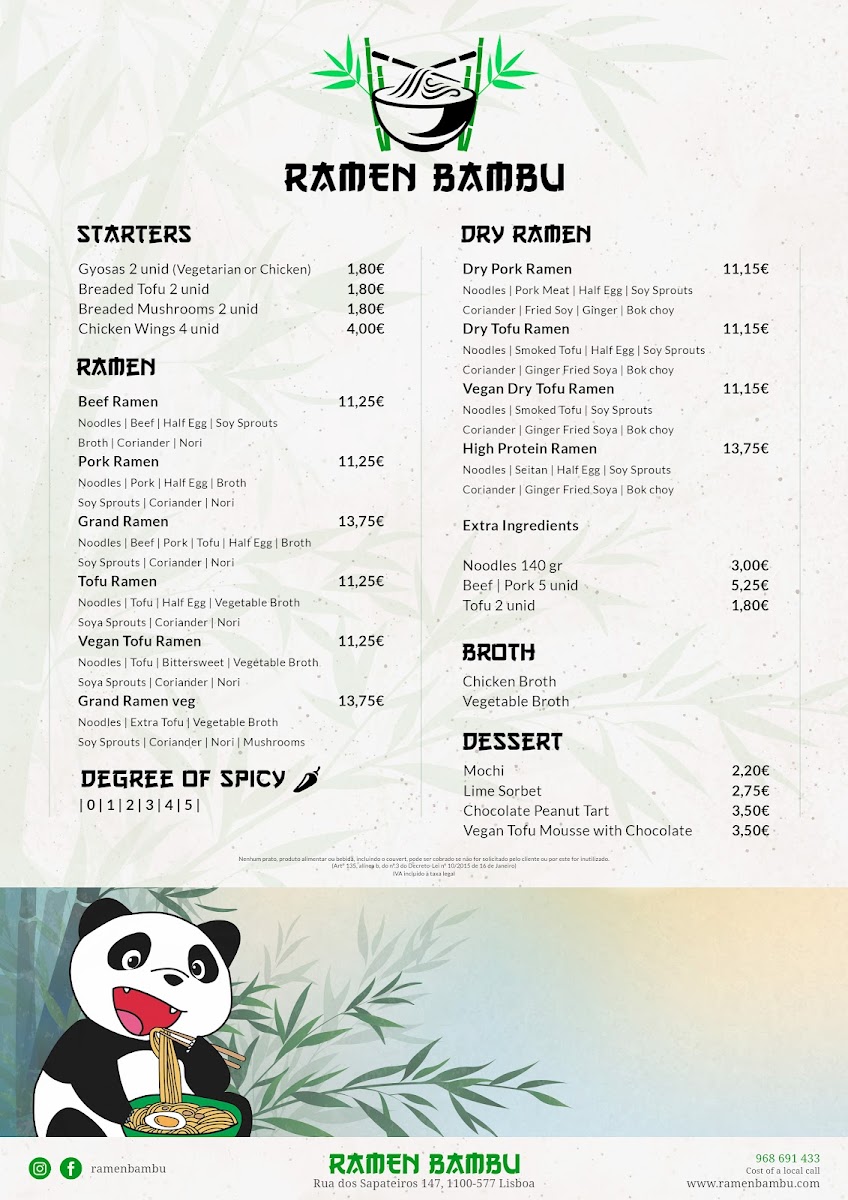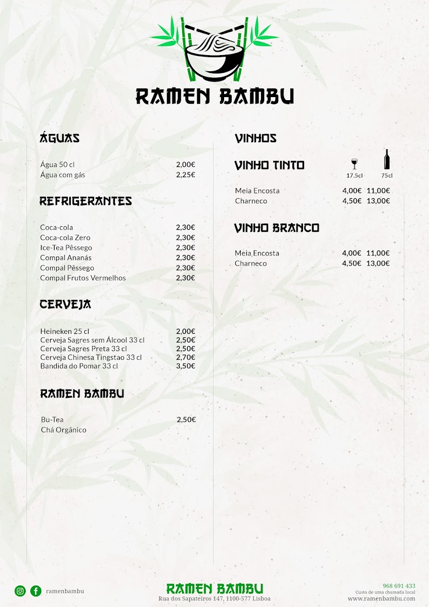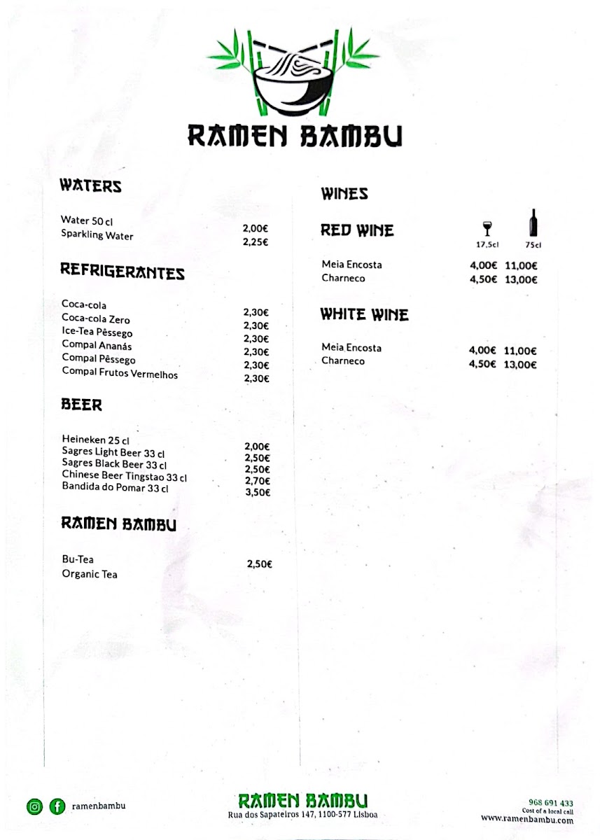 The attention to detail is evident in every bite, promising a delightful experience that truly warms the soul. With refreshing beverage options like Tsingtau and Bandida Do Pomar, the restaurant complements its main dishes beautifully. Whether you are a seasoned ramen lover or a newcomer, Ramen Bambu Lisboa invites you to indulge in a bowl of comfort that celebrates the rich flavors of Japan right in the heart of Portugal.